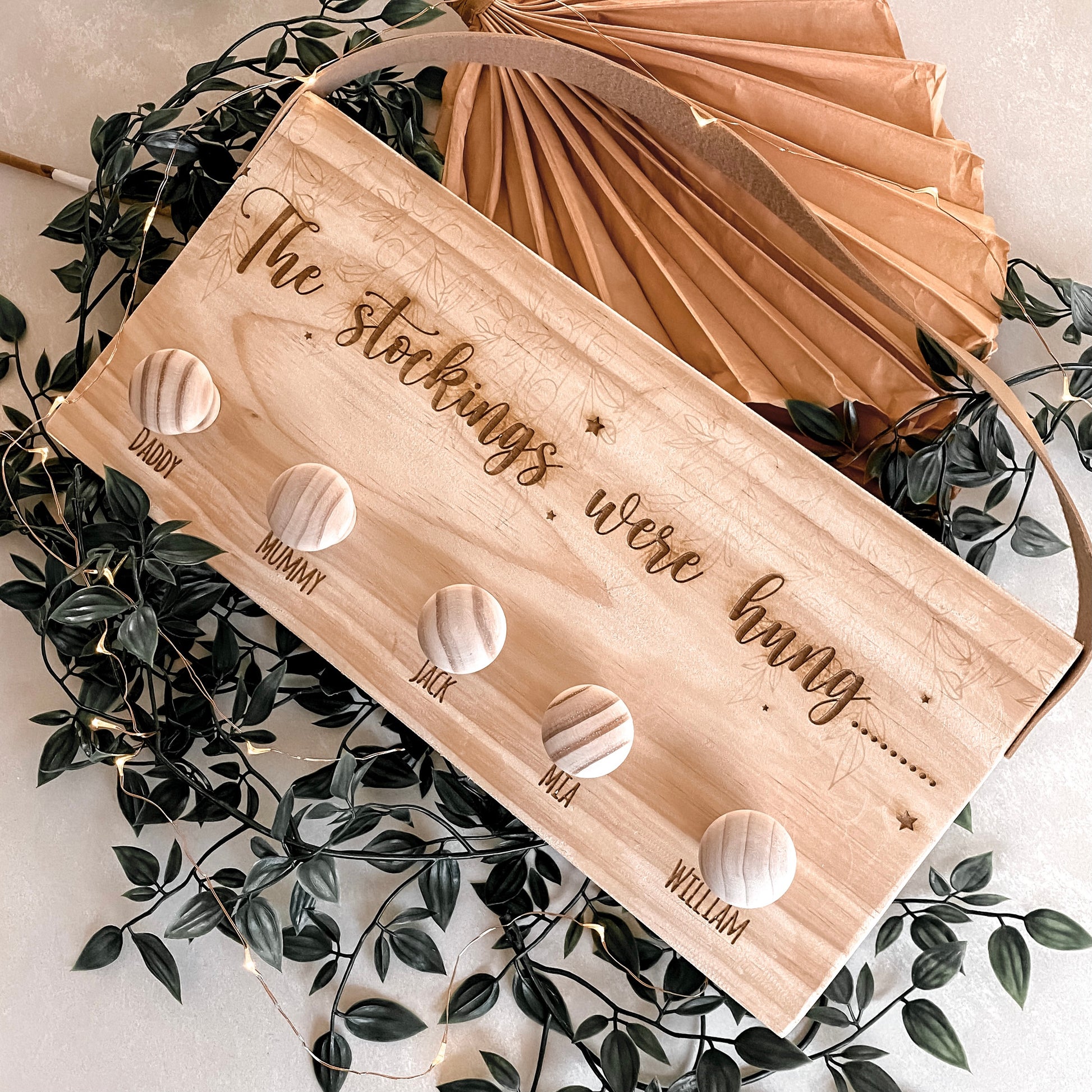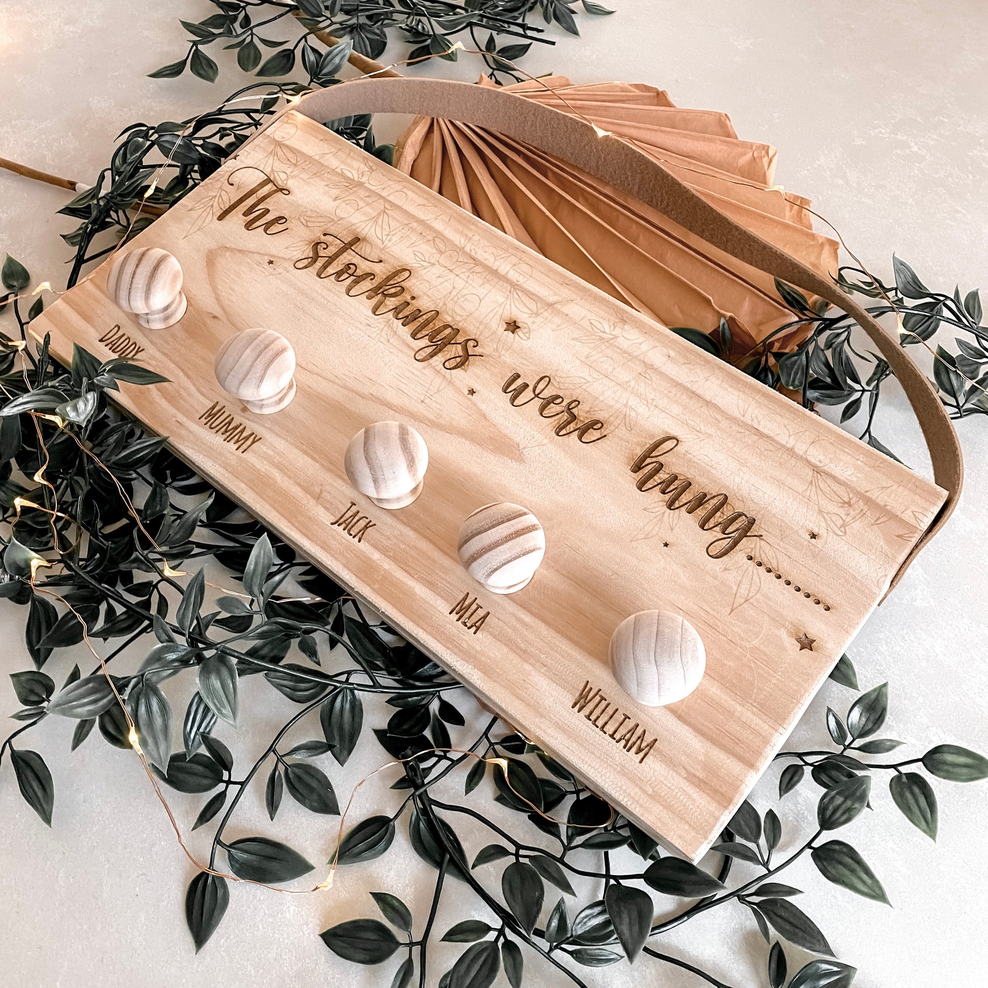 2. The stockings were hung: features timber hanging knobs and an leather hanging strap and laser etched design.