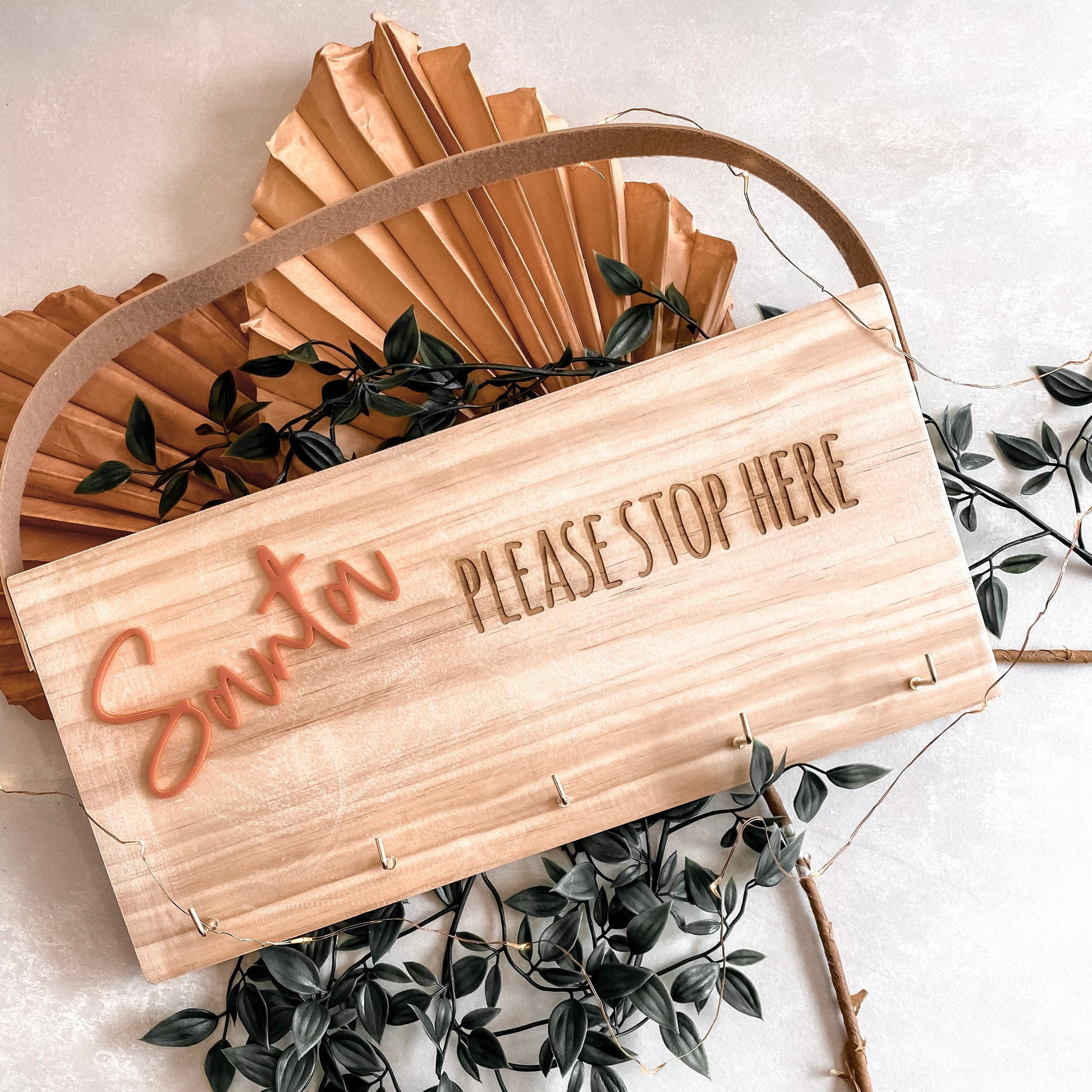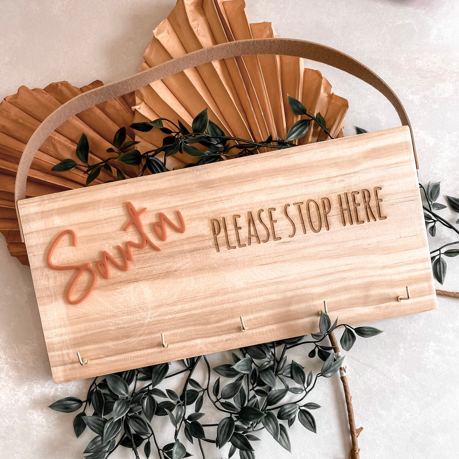1. Santa please stop here: features gold look hooks, tan leather hanging strap and laser etched design with an acrylic 3D feature.