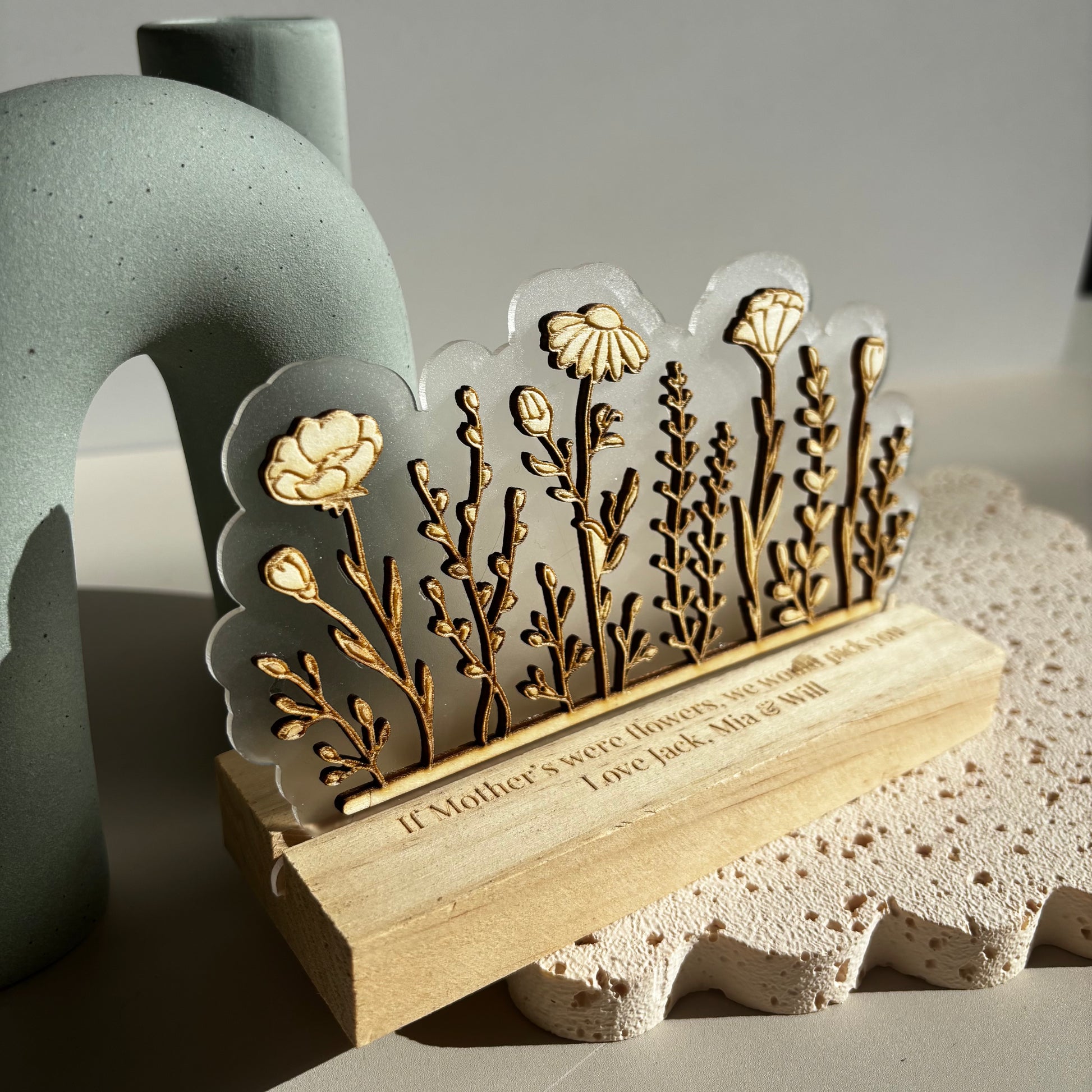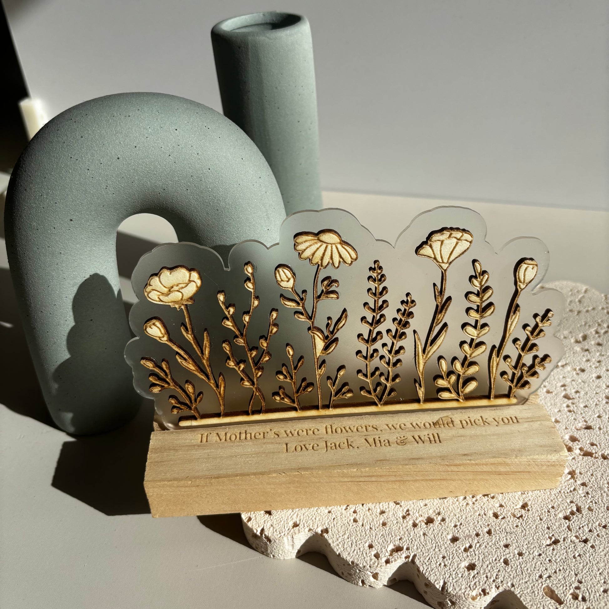 Our laser-etched timber flower bed is a beautiful way to give blooms that never fade. Each floral piece is delicately etched and layered on a frosted acrylic backing, creating a soft, modern display full of meaning and charm.