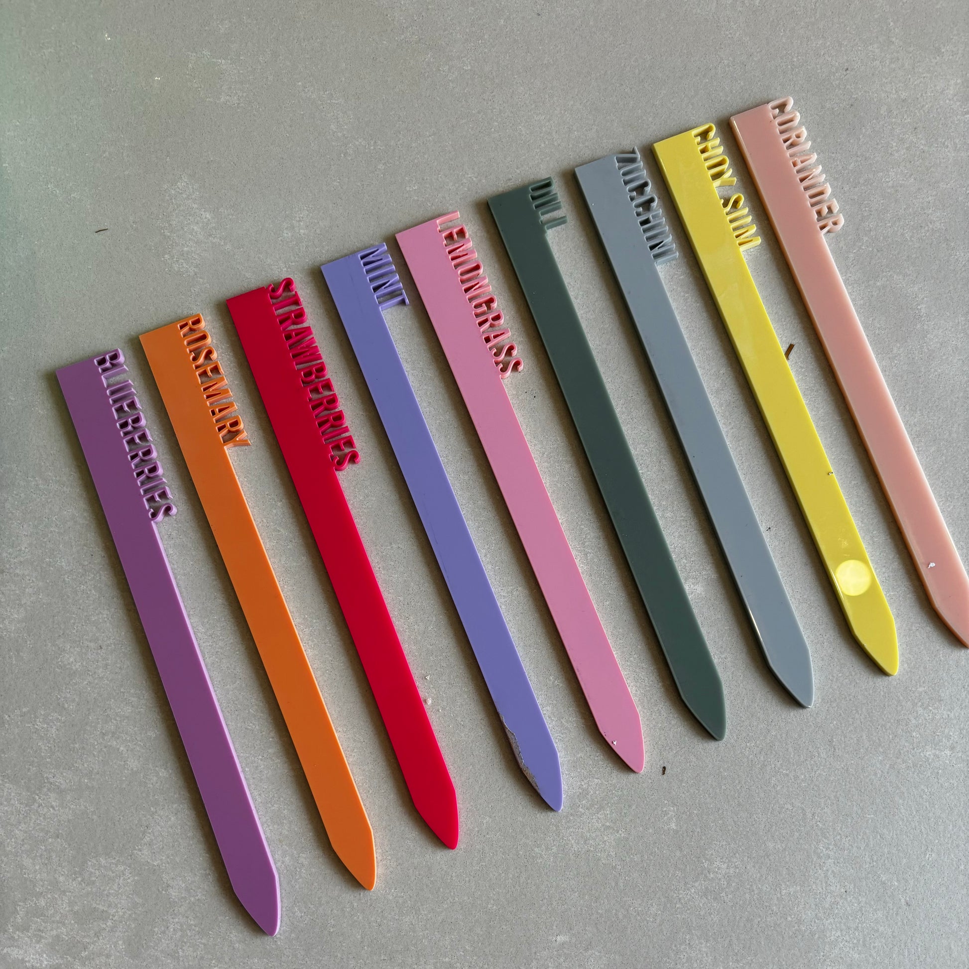 Set of SIX acrylic stakes including all your popular herbs. Set includes: parsley, basil, rosemary, thyme, oregano and mint. Colours will vary.