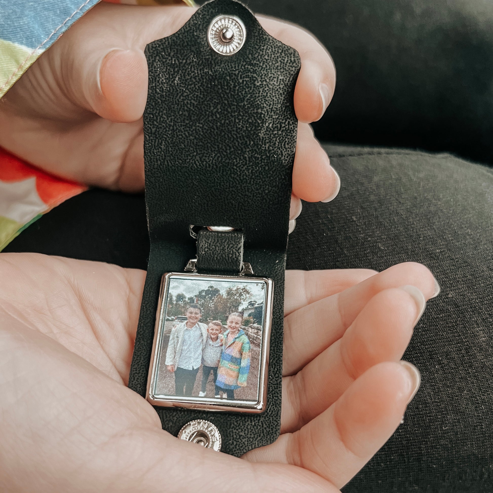 Discover the perfect way to always have your loved ones close to your heart with our Leather Photo Tag! Featuring a press stud opening, this tag allows you to easily reveal a cherished photo. Keep your memories close wherever you go with this stylish and heartfelt accessory.