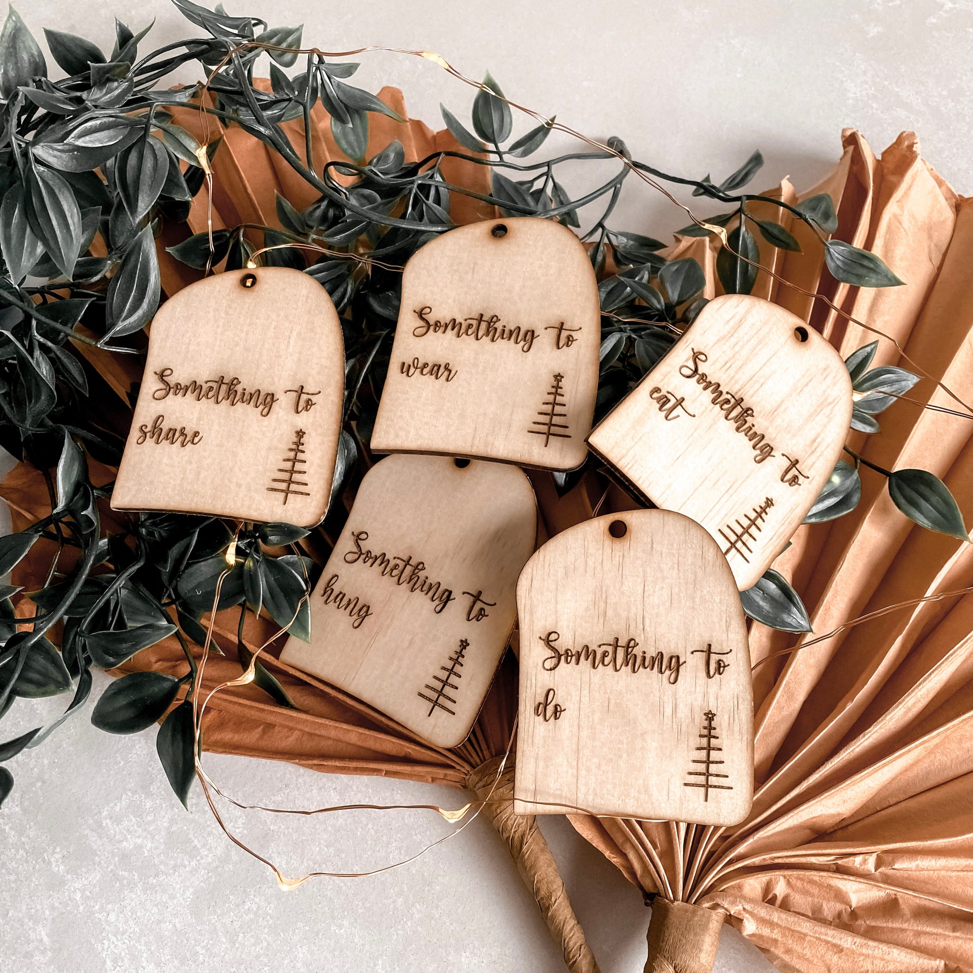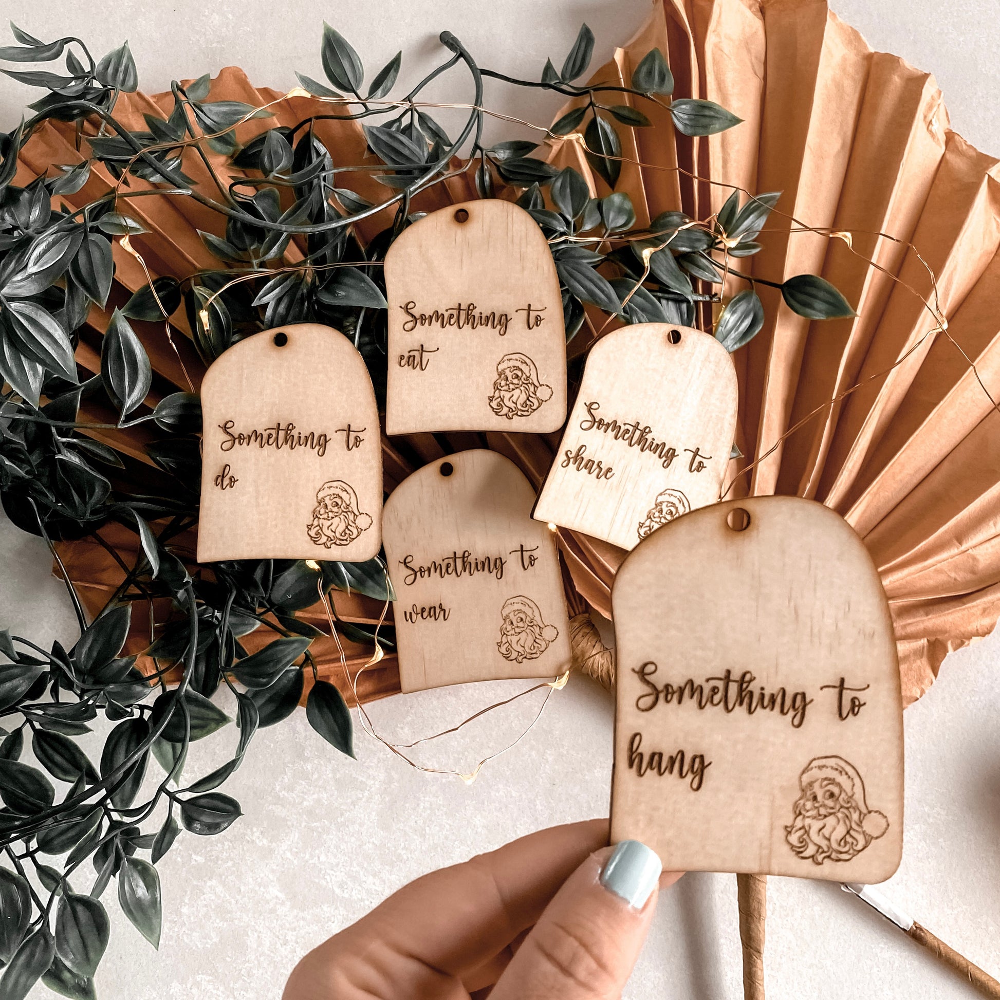 Set of 5 tags with the phrases laser etched. Gift tags measure approx 80mm height and have a hole to attach ribbon to.
