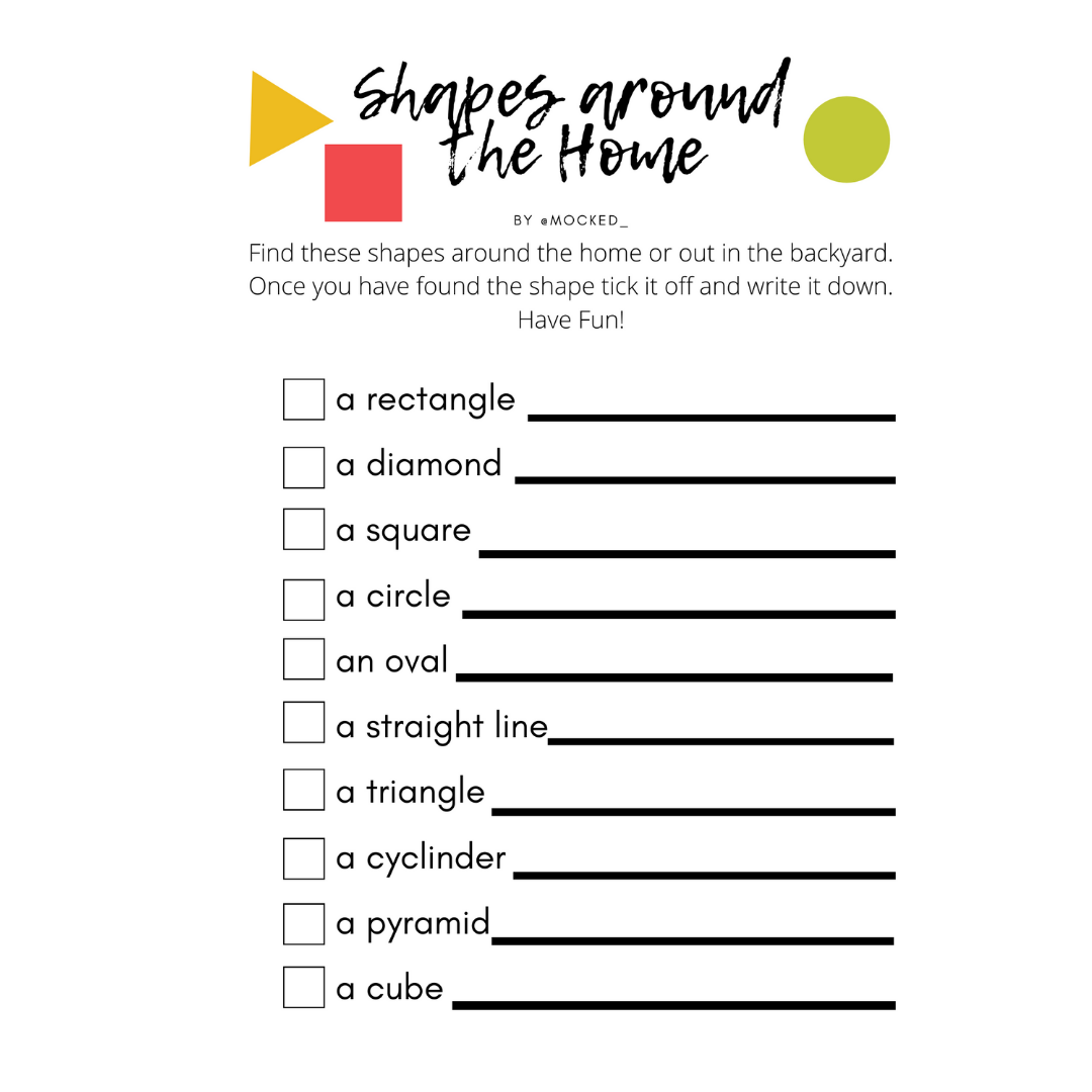 Kids pack activities include: backyard scavenger hunt, neighbourhood scavenger hunt, indoor scavenger hunt, measurements around the home, shapes around the home, look and find, memory, find the shape.