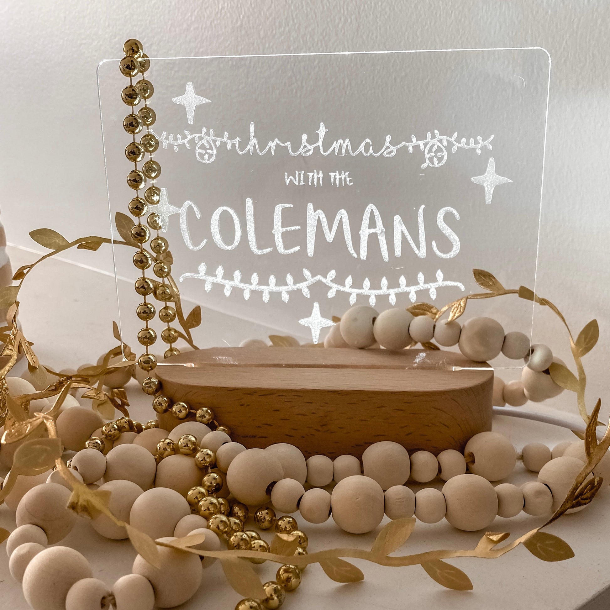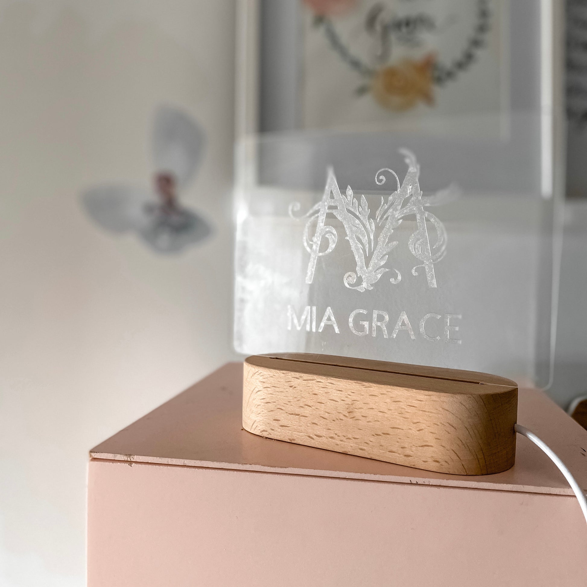 Create a peaceful and personalised space with our LED night light - the perfect addition to any room! Our durable beech wood base is powered by USB and emits a bright white light through a clear acrylic insert, featuring a laser etched name or design of your choice. Even when the light is off, your unique design will still shine through!