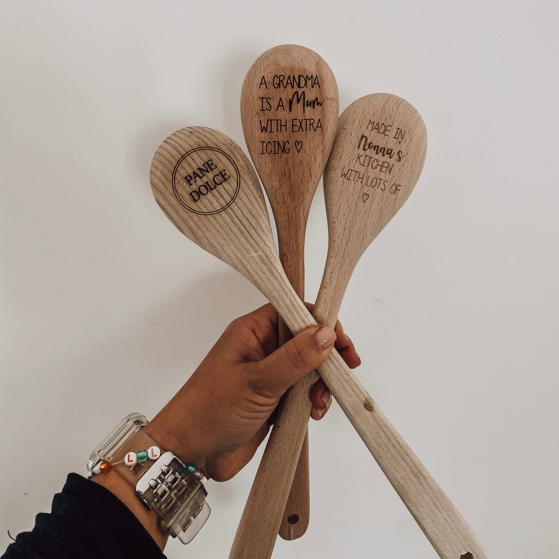 Natural beechwood spoon ideal for that personal touch in the kitchen. Spoon measurements: 33cm long x 6.5mm wide x 2cm thick